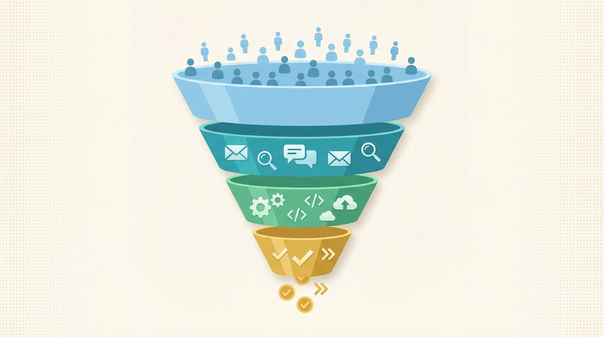 広告なしでSaaSを成長させる導線設計は、「セールスファネル」のフレームワークに基づきます。潜在顧客が製品を認知し、購入に至るプロセスを漏斗(ファネル)で表現したものです。ここでは個人SaaSに特化した、実践的な5ステップで解説します。