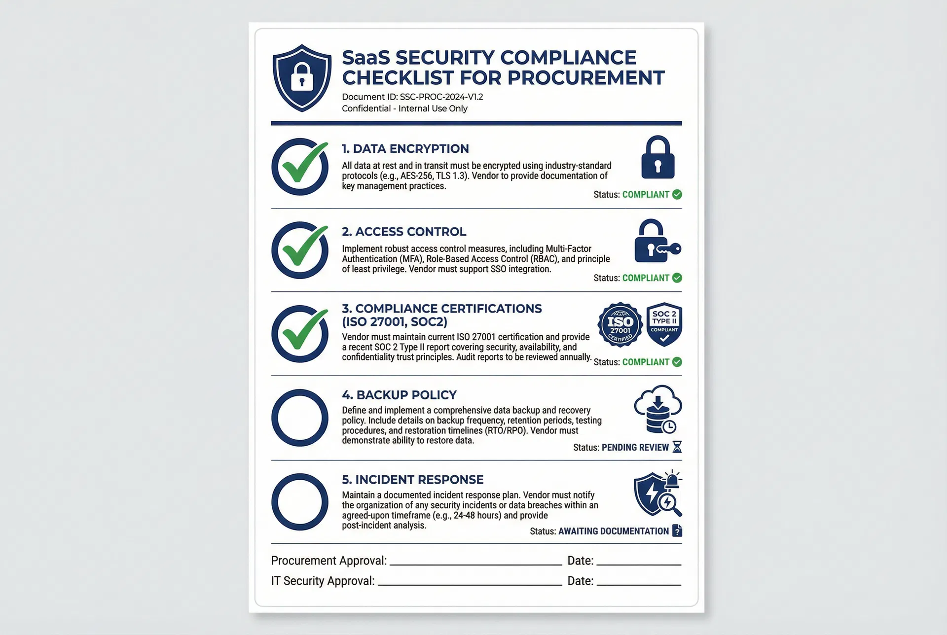 SaaSはクラウド上で提供されるため、企業の機密情報を外部に預けることになります。そのため、情報システム部門や経営層はセキュリティを強く懸念します。「情報漏洩のリスクは?」「不正アクセス対策は?」といった問いに明確に答えられなければ、承認は得られません。ISMS認証の取得状況やデータの暗号化など、具体的な対策を提示できない稟議書は信頼性に欠けます。